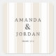 Cet autocollant de mariage présente un design classique et élégant avec des bandes verticales beige et blanc, créant un fond subtil mais sophistiqué. La typographie est le point focal, mettant en valeur des polices sérif grasses pour les noms "Amanda & Jordan" et une police plus petite et plus légère pour "merci", transmettant la chaleur et la gratitude. La palette de couleurs atténuées de beige doux et de blanc croquant améliore son attrait intemporel, ce qui la rend parfaite pour exprimer sa gratitude lors de mariages ou d'autres événements formels. Ses lignes épurées et son espace négatif généreux assurent la lisibilité tout en conservant une élégance discrète idéale pour toute occasion sincère.