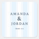 Cet autocollant de mariage élégant présente un design minimaliste avec des bandes verticales alternées bleu clair et blanc, créant un fond subtil et sophistiqué. La typographie serif propre en bleu marine foncé met en valeur les noms "Amanda & Jordan" en tant qu'espaces réservés personnalisables, tandis que la phrase "merci" ajoute une touche de gratitude en dessous. Le style moderne et discret transmet la sophistication et la gratitude, ce qui le rend parfait pour exprimer vos remerciements lors de votre événement spécial. Sa composition simple et sa palette de couleurs douces garantissent qu'il complète parfaitement n'importe quel thème de mariage.