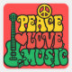 Type design of PEACE, LOVE & MUSIC with guitar, symbole, heart and musical notes in yellow, red and green.