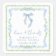 Autocollants de remerciement élégants pour la douche de la mariée pour vos faveurs de fête et cartes de remerciement avec des cadres aquarelles floraux bleus et verts vintage inspirés du grand millénaire, un ruban coquette bleu délicat aquarelle, "amour + merci" présenté dans une écriture calligraphique bleue élégante, et le nom de la mariée et la date de la douche en typographie serif classique.