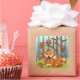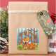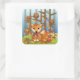 Cet autocollant a une illustration vectorielle montrant un renard adorable dans un bois d'automne avec des chouettes mignonnes sur les branches. Autour sont tombés feuille dans les couleurs de l'automne. Il est possible d'ajouter du texte.