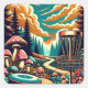 Un parcours de golf à disque coloré unique dans un champ de champignons rétro, pins et nuages aux couleurs vintages comme l'orange, le bleu et le rouge.