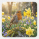 In a sunlit garden, a robin sings atop a moss-covered rock into a yellow daffodil, surrounded by blooming bluebells and daffodils in springtime