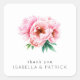 This wedding sticker features a beautiful floral design with soft pink peonies and lush green leaves, creating an elegant and romantic look. The simple layout centers the flowers, complemented by clean, modern typography for a "thank you" message below. With its gentle color palette and semi-realistic style, this sticker conveys warmth and appreciation, perfect for expressing gratitude at weddings or special events.