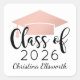 Les autocollants de graduation personnalisés présentent un design personnalisé moderne et élégant avec le nom du diplômé, leur année de classe dans le script de calligraphie noir tendance, et un motif casquette rose or / rose roux couleur grad. Utilisez pour mettre en valeur les enveloppes de cartes de faire-part ou les faveurs de remise de diplômes!