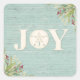 Belle Stickers Plage à thème pour tous vos cartes de fin de année de Noël. Décoré avec le mot joie, un dollar de sable, des herbes de plage et un arrière - plan en bois. Conçu pour vous par Blackberry Boulevard.
