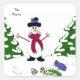 Une jolie scène hivernale avec un mignon bonhomme de neige dans la forêt avec des arbres, et un petit oiseau bleu qui regarde quelques cônes de pin et une branche.