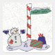 Le bonhomme de neige est habillé de gants et de boutons bleus. Le bonhomme de neige est debout à côté d'un poteau blanc et rouge avec un signe vert qui dit "pôle Nord". Les cadeaux sont à côté du pôle. De la neige blanche est posée sur le sol. Les autocollants sont disponibles avec un dossier blanc ou noir.