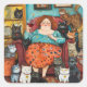L'image représente une femme joyeuse, plus grande, une femme chatte sans enfant, assise confortablement dans un fauteuil confortable, tenant un verre de vin rouge. Elle est entourée d'une multitude de chats colorés et expressifs, dont beaucoup sont assis sur ses genoux, à ses côtés, ou assis à proximité. La scène dégage un sentiment de chaleur et de détente, avec des couleurs vives, des motifs ludiques et une atmosphère animée, comme la femme sourit avec contentement, en appréciant la compagnie de ses compagnons de félins. Le cadre fantaisiste et joyeux ajoute du charme à cette illustration excentrique et réconfortante.