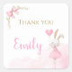 Add a sweet finishing touch to your baby girl’s first birthday celebration with these personalized “Some Bunny” thank you stickers. Featuring a watercolor bunny in a blush pink dress, delicate floral accents, and a classic pink bow, these square stickers are perfect for sealing treat bags, party favors, gift packaging, and thank you notes.