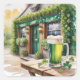 A watercolor painting of a charming Irish pub decorated for St. Patrick's Day, with emerald green shamrocks and festive banners adorning the rustic wooden exterior. The pub features a classic dark green door with brass fixtures and window boxes overflowing with vibrant green ivy and white flowers. On a small outdoor table sits a frothy green beer with a perfect foam head, surrounded by delicate four-leaf clovers scattered across the weathered wood surface. The entire scene is rendered in soft, flowing watercolor washes with gentle bleeding edges, creating a dreamy atmosphere filled with warm golden sunlight filtering through the Irish countryside.