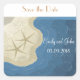 Une plage de sable avec deux étoiles de mer et des vagues bleues. Un thème chaleureux de mariage sur la plage...