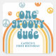 Super One Retro inspiré autocollants de premier anniversaire avec polices de style 70's et couleurs arc-en-ciel et signes de paix.