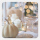 Stickers avec une belle photo classe. Une table de vacances Thanksgiving avec porcelaine fine et verrerie. Fancy or bokeh lumières dans l'arrière - plan. Une simple épaisse épaisse est posée sur une assiette.