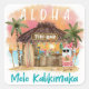 Les autocollants de Noël tropicaux (ou sceaux d'enveloppe) représentent le Père Noël profitant de vacances dans un bar Tiki sur la plage au coucher du soleil avec des palmiers, des lumières de fête et des salutations hawaïennes "Aloha" et "Mele Kalikimaka". Des cocktails tropicaux, un ananas, un hibiscus et des feuilles de palmier, une planche de surf et un perroquet avec un chapeau de pirate décorent le bar. Œuvre de KL Stock