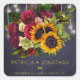 Un autocollant de mariage de style rustique ou un autocollant de carré d'expédition avec un grand et rustique tournesol jaune et bouquet de rose bordeaux rouge et script de typographie faux or sur un arrière - plan de calboard bleu marine de minuit foncé avec des lampes à cordes. Idéal pour votre hiver fleuri, Noël, fin d'été ou automne automne | élégant pays rustique | jardin extérieur vintage mariages traditionnels à thème. Personnalisez-le avec les noms de la mariée et du marié et les détails du mariage !