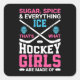 stickers de thème de hockey pour la fille de hockey avec des rondelles de hockey, des bâtons et des casques avec texte rose, blanc et bleu qui lit Sugar, épice et tout Ice C'est de quoi les filles de hockey sont faites!