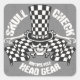 Le logo de la fiction, "Skull Check Motorcycle Head Gear", présente un crâne et des os croisés avec un chapeau à damiers et des drapeaux à damiers.