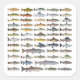 De gauche à droite 1 : truite Brown, truite de ruisseau (omble chevalier), truite arc-en-ciel, truite gillarou, rangée 2 : truite séchée, omble chevalier, corégone (corégone), truite blanche de montagne, rangée 3 : truite gila, truite Dolly Varden (omble char), truite d'Apache, truite de l'Est ian Grayling row 4 : Lake Whitefish, Tiger Trout (truite hybride), Golden Trout, Blunt-snouted lenok (truite), Powan (corégone) row 5 : Ferox Trout, Lake Trout (omble chevalier), Adriatic Trout, Jaune Grayling, Windermere Char row 6 : Trout méditerranéen. European Whitefish, European Grayling, Whitespoted Char, Truite caspienne ligne 7 : Cisco, Trout d'or mexicain, Red Charr, Baikal Black Grayling, Amur Grayling ligne 8 : Truite en tête, Grayling mongol, Upper Yenisei Grayling, Corégone à dos d'épaule, Cisco de sardine ligne 9 : Truite abante, Taibéen Kirikuchi Char, Boganida Char ligne 10 : corégone ronde, Grayling Kosogol, Truite Draa, Ammersee Char, Grayling blanc Baikal