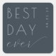 Cette autocollant de mariage présente un design moderne et élégant avec un fond bleu marine foncé. La phrase "BEST DAY ever" est affichée bien en vue en lettres majuscules grasses associées à une écriture cursive pour un contraste sophistiqué. La mise en page minimaliste met l'accent sur la simplicité, en utilisant l'espace négatif pour mettre en valeur le texte. Parfait pour célébrer votre jour spécial, cet autocollant transmet une ambiance joyeuse et optimiste, ce qui en fait un ajout idéal à votre décoration de mariage.