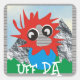 Un autocollant amusant avec un troll fourré au nez tricoté. Uff da écrit sur ses pieds. par EML