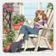 Sticker Carré Une femme avec café, chat et Plante
