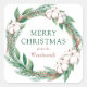 Cet autocollant de vacances personnalisé présente une couronne d'aquarelle de verdure d'hiver verte et brune, y compris des sprigs de pin et du coton. Les mots "Joyeux Noël" apparaissent dans la police serif verte. Personnalisez le design avec votre nom de famille ci-dessous en italique marron.