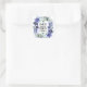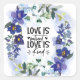 Un autocollant carré de citation inspirante chrétienne de l'Écriture représente un élégant dessin à l'aquarelle florale avec des orchidées violettes et blanches simples et de la verdure. Il présente une citation inspirante Verset biblique 1 Corinthiens 13:4, "L'amour est patient, l'amour est bon."