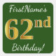 Sticker Carré Vert, Faux Gold 62e anniversaire + Nom personnalis