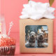 Cette conception festive capture l'esprit joyeux de la saison des fêtes, mettant en vedette des chiens adorables. Nichés dans un pays des merveilles hivernal, avec un arbre de Noël décoré et des cadeaux magnifiquement emballés. Les flocons de neige tombent doucement, ajoutant une touche magique à la scène, tandis que les couleurs vives des décorations de Noël créent une atmosphère chaleureuse et joyeuse.