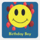 Visage gris classique entouré de ballons rouges et texte d'anniversaire garçon.