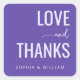 This wedding sticker features a modern, minimalist design with a deep purple background and white text. The layout is simple yet elegant, showcasing the words "LOVE" and "THANKS" in bold, uppercase sans-serif fonts, complemented by a smaller cursive script for "and." The clean composition emphasizes gratitude and affection, making it perfect for expressing heartfelt sentiments at weddings or special occasions. Its straightforward aesthetic ensures readability while conveying warmth and appreciation.