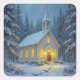 A charming church, nestled in a snowy forest landscape, glows warmly from its illuminated windows, creating a beautiful contrast with the cool, tranquil surroundings