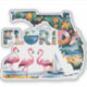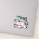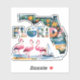 Plan de l'État de Floride avec une forme emblématique remplie de flamants roses tropicaux, scènes de vergers d'orangers et paysages côtiers sur des autocollants vinyle kiss cut pour coller sur tout votre équipement favori, des cahiers et téléphones aux planches à roulettes et même voitures. Disponible en plusieurs tailles pour répondre à tous vos besoins.