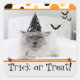 Design propose un chaton gris et moelleux extra éffrayant portant un casquette de sorcière noire avec des chauves-souris d'Halloween volant autour. Tag a des accents noir, orange, jaune et gris et dit Trick ou Treat au bas dans un script simple noir.