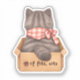 Chat gris duveteux assis confortablement à l'intérieur d'une boîte en carton. Le txt "Si ça rentre, ça s'assoit" exprime la règle de comportement innée du chat.