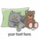 Chat de courte durée britannique gris mignon assis avec un jouet de chat et un ours en peluche. Le chat espère que leur précédent malheur dans lequel ils sont entrés est reproché au chien.