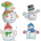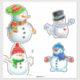 Four playful snowmen illustrations in bold, festive colors, each with hats, scarves, mittens and a broom or top hat. Great for holiday campaigns, winter scenes, greeting cards, and family-themed designs.