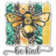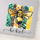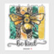 Un autocollant inspirant mignon avec une abeille au miel assise sur un arrière - plan turquoise, jaune, guépard/empreinte de léopard de brosse. Le texte dit : "Sois gentil."