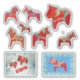 Cette page d'autocollants présente une collection de modèles de chevaux de dala de dessins de chevaux de dala en bois, conçus, sculptés et peints par Julia Persson Morrill