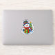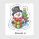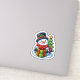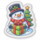 Ce charmant autocollant de vacances présente un charmant bonhomme de neige portant un chapeau haut orné de saint. Il se trouve à côté d'un sapin de Noël décoré, tenant un cadeau vert joliment emballé, incarnant l'esprit joyeux de la saison.