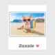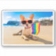 Cette jolie photo montre un chien chihuahua sur la plage portant un drapeau Gay pride de couleur arc-en-ciel.