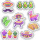 Un autocollant Cinco de Mayo avec avocados, limes, sombrero, moustache, danseur, homme, pinata, tacos et cactus.