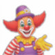 Clown de dessin animé vibrant avec des cheveux rouge vif, de grands yeux verts et un large sourire. Porte un chapeau violet avec une bande jaune, un col jaune et une chemise rayée, faisant un geste amical.