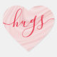 Autocollant en forme de cœur avec une texture de tourbillon de satin rose tendre et texte rouge "câlins". Utiliser comme sceaux d'enveloppe, autocollants pour cadeaux et faveurs, emballage de produits, artisanat et scrapbooking etc