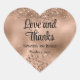 Cet autocollant affiche le message "Amour et Merci" avec le nom de la mariée et la date du mariage sur une parties scintillant rose en or et un arrière - plan de papier.