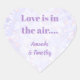 Un fond bokeh lilas et argent, cet autocollant en forme de cœur comporte "L'amour est dans l'air" avec le nom du couple écrit en dessous. Commandez le vôtre aujourd'hui !