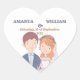 Ce bel autocollant mariage présente une charmante illustration d'une mariée et d'un marié en forme de coeur. Le marié est représenté avec des cheveux bruns courts, un teint clair, et porte une veste de costume bleu marine sur une chemise bleu clair et une cravate blanche. Il a une petite boutonnière épinglée sur son revers. La mariée se tient à côté de lui, souriant doucement. Elle a des cheveux ondulés, rougeâtre-oranges, ornés d'une couronne de fleurs rose, orange et blanche. Un délicat voile blanc coule derrière elle. Elle porte une robe mariage blanche avec un collier d'amoureux et un collier de perles. Cette illustration simple, en forme de dessin animé, suggère un lien amoureux des cordes entre eux. C'est fantaisiste et attachant, donnant un ton joyeux au prochain mariage. Tous les textes sont personnalisables