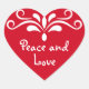 stickers rouge en forme de coeur mignon avec une floraison blanche et un message positif pour les vacances. Paix et Amour en lettres blanches. Ils confèrent de jolies enveloppes pour vos cartes et lettres de Noël. Joyeux Noël, Joyeux Nouvel An, paix et amour pour et le vôtre.