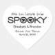 Typographie Éffrayante amusante et décalée Halloween Sauvons la Date Stickers en blanc et noir avec un design de texte amusant du mot "éffrayant" avec une paire de fantômes charmants hantant les deux lettres "O". Ce design chic est parfait pour annoncer votre rendez-vous mariage autour ou sur Halloween. Facile à customiser, il suffit d'ajouter les détails de votre mariage dans les champs de texte fournis. Pour plus d'options de personnalisation, cliquez sur le bouton "Customiser" pour modifier les polices, les couleurs de texte ou déplacer l'élément de conception.